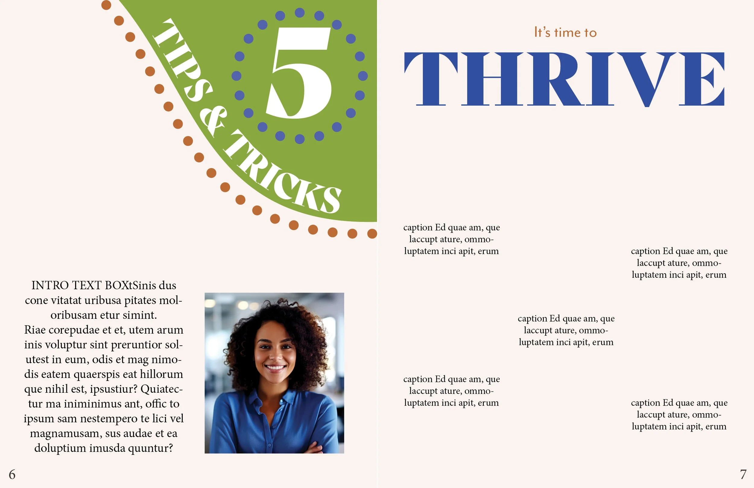 The proposed layout shows the color, opacity, and overlapping elements as shown in the inspiration. A few different layout ideas were used for the “Tips & Tricks” spread for composition and legibility.